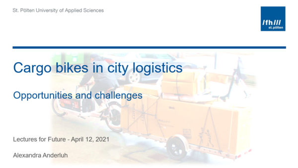 Im Rahmen der Lectures for Future, einer interdisziplinären Vortragsreihe der Scientists for Future, die aktuelle Einblicke in wissenschaftliche Arbeiten zu Klimakrise, Umwelt und Gesellschaft gibt (https://at.scientists4future.org/lectures/), hielt Alexandra Anderluh am 12.04.2021 eine Vorlesung zu den Einsatzmöglichkeiten von Lastenrädern in der Stadtlogistik. Dabei beleuchtete sie Chancen und Herausforderungen für Lastenräder in urbanen Lieferketten, wofür sie Ergebnisse aus ihren Forschungsprojekten zusammenfasste und in Hinblick auf Umwelt und Gesellschaft aufbereitete.