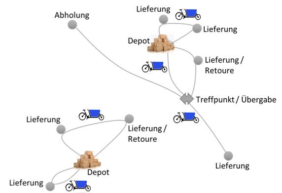 Am 18.3.2021 hielt Alexandra Anderluh gemeinsam mit ihren Forschungskolleginnen Pamela Nolz und Beate Hauser im Rahmen des 1. Online-Stammtisches des Damenlogistikclubs einen Vortrag zum Thema „Grätzl & Hub – Vernetzte Radlogistik mit sozialem Mehrwert“, ein Forschungsthema, dass die drei bereits mehrere Jahre verfolgen. Untersucht wird dabei die Möglichkeit, Mikrohubs, das sind kleine Standorte in der Stadt zum Umladen von Paketen und ähnlichen Gütern von konventionellen Lieferfahrzeugen auf alternativ betriebene kleine Fahrzeuge wie Lastenräder, für die Zustellung auf der letzten Meile zu nutzen und dabei auch einen sozialen Mehrwert für die unmittelbare Umgebung (= das Grätzl) des Mikrohubs zu erzielen – daher der Name „Grätzlhub“. Der Einsatz von Lastenrädern wird dabei sowohl von der Anwendungsperspektive beleuchtet als auch aus Sicht der spezifischen Anforderungen in der Tourenplanung.